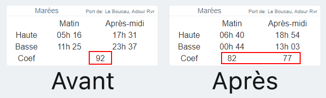 Depuis l'origine, on avait décidé pour simplifier la lecture de n'afficher qu'un seul coefficient par jour dans le widget de marée, car entre le matin et l'après midi, le coefficient bouge en général peu.