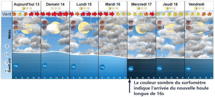 Dorénavant, avec Yadusurf, vous pourrez repérer en un coup d’œil les houles longues ! La couleur du graphe indique la période de la houle : plus c’est sombre, plus la période est longue.